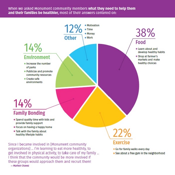 A team of community members ranging between 15 and 71 years old learned about oral history methodology and then conducted interviews with their neighbors on topics such as exercise, food, safety, community and family. After reflecting on what they heard and experienced, they offered recommendations on ways to improve their community’s health.